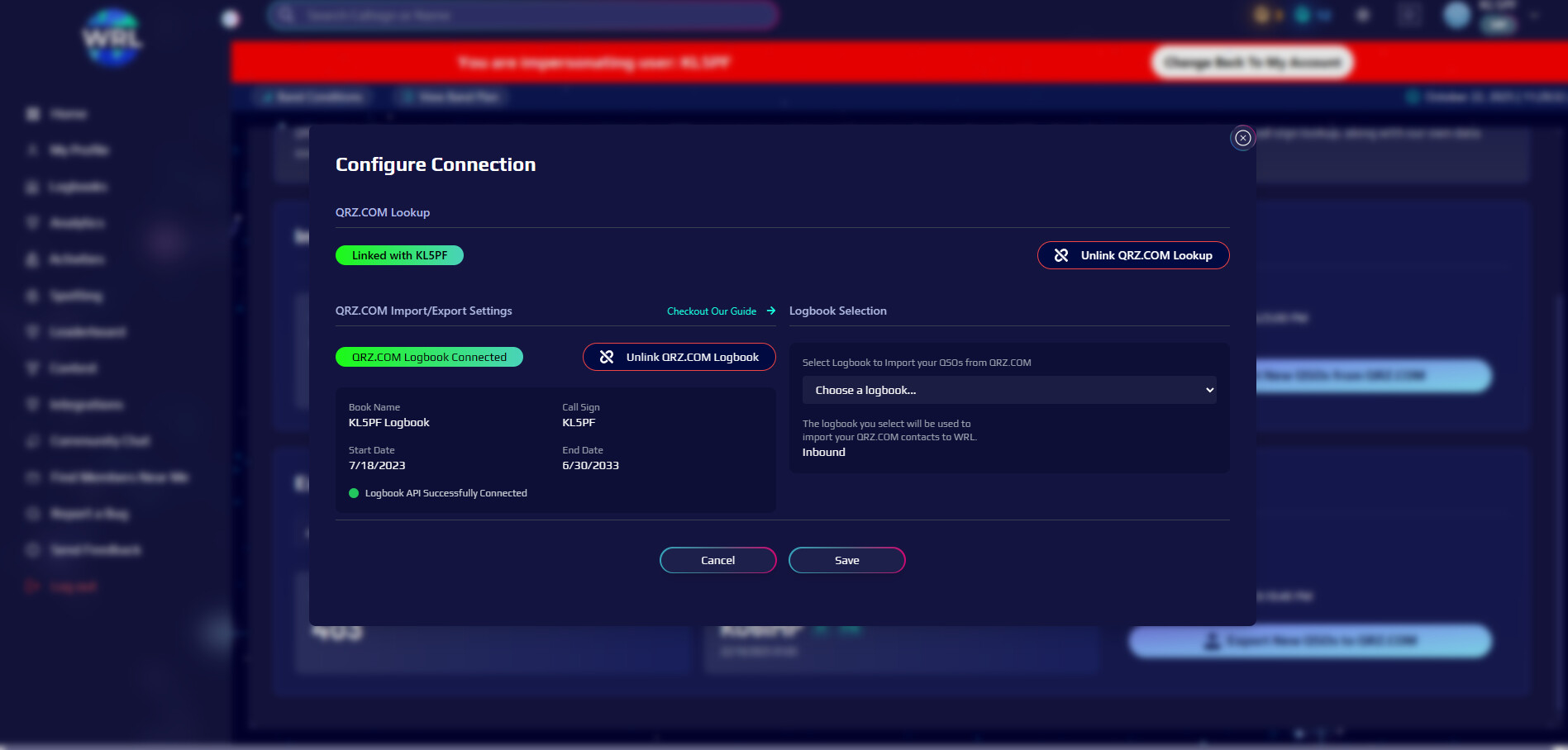 I just checked your account and it doesnât look like you have QRZ import/export enabled (âlinkedâ). Make sure you goto the integrations page and then enter your QRZ API key from your QRZ logbook and then select your WRL Logbook from the drop down and make sure you click the save button.